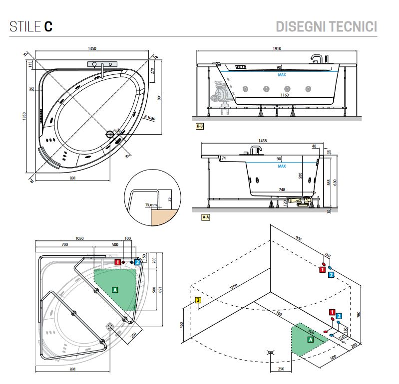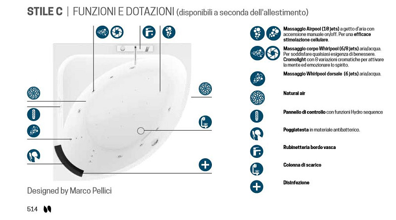 Airpool Bathtub Stile C Hydro Air 135x135 complete withCushion