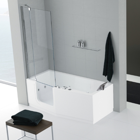 Refugio en vidrio transparente de 6 mm con perfil de cromo pulido que mide 80 x 150y solo se puede montar en tinas de novellini de iris