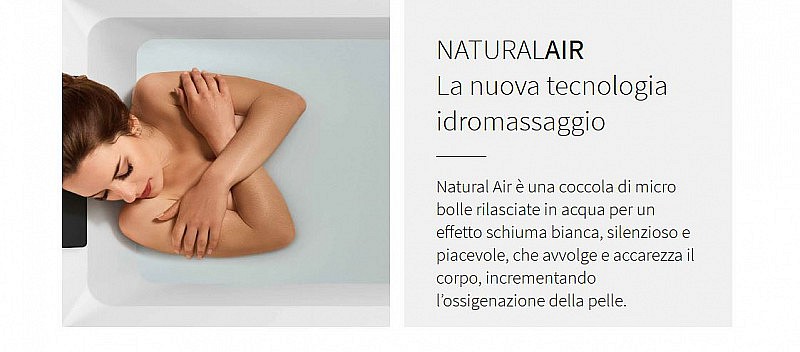 -Natural Air Micro burbujas que en el agua producen un efecto de espuma blanca que envuelve y acaricia el cuerpo, aumentando la oxigenación de la piel. el masaje penetra y suaviza todo el cuerpo, se limpia la piel, se vigoriza y se eliminan las impurezas.