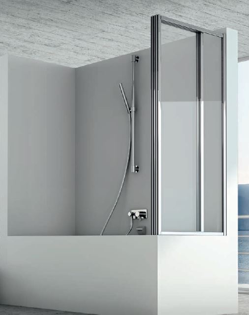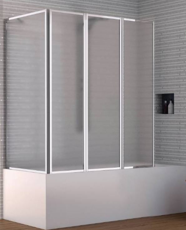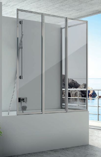 Cloison de baignoire avec trois portes à ouverture pliante et une porte fixe.