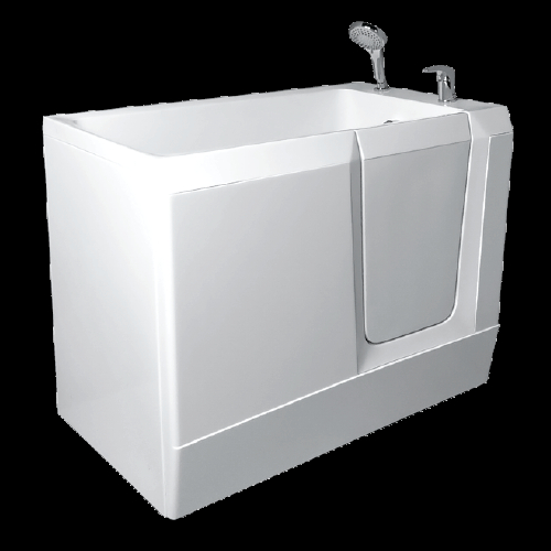 Baignoires120x70 avec siège et porte profilés, structure autoportante, robinet mitigeur monocommande, douchette