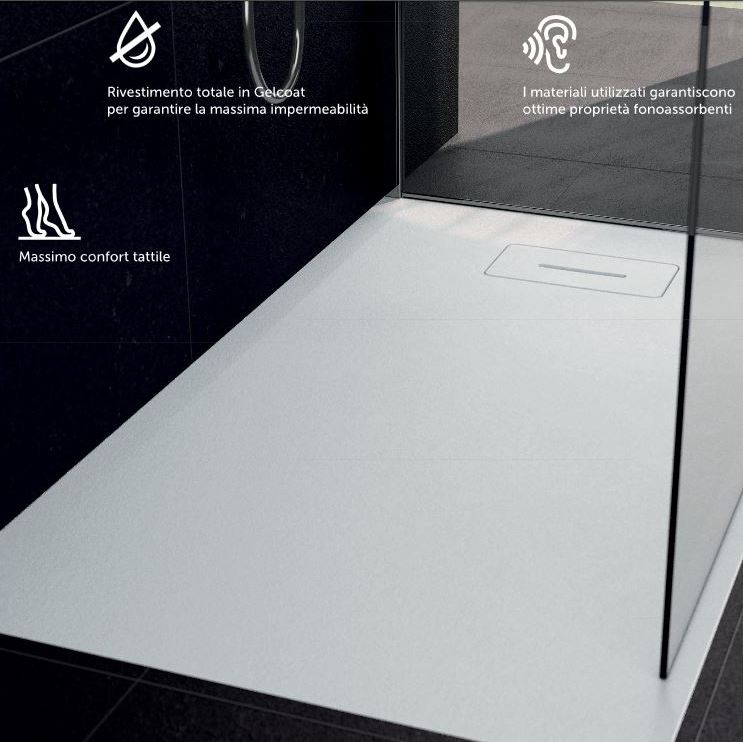 Piatto Doccia Novosolid 150x70 sp3.5 dall'effetto Pietra prodotto in Carbonato di Calcio al 75% e Resina di Cristallo di quarzo 25% con rivestimento in gelcoat per garantire la massima impermeabilitail Monatggio puo essere a filo pavimento oppure in appoggio su piedini regolabili